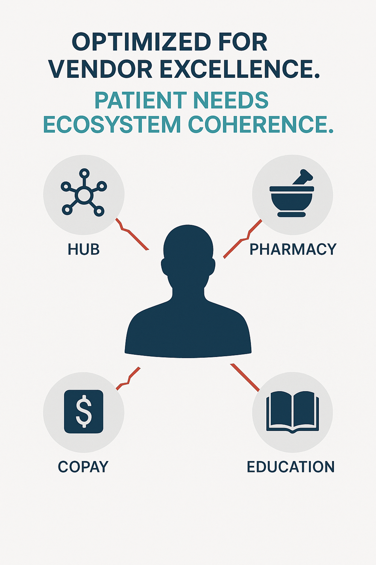 A patient starts a specialty therapy. They're enrolled in your hub (Vendor A), receive copay support through a foundation (Vendor B), get medication from a specialty pharmacy (Vendor C), and access education through a digital platform (Vendor D).